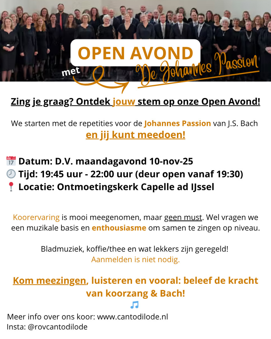 We starten binnenkort met het repeteren van de Johannes Passion, die we 21 maart 2026 hopen uit te voeren in Schiedam. Of je nu al veel gezongen hebt of nog maar net ontdekt hoe mooi koorzang is: bij ons klassiek koor krijg je de ruimte om te groeien en te genieten. Tijdens onze open avond: ✔️ Maak je kennis met het koor en onze dirigent ✔️ Zing je mee tijdens een open repetitie ✔️ Ervaar hoe het is om samen prachtige muziek tot leven te brengen ✔️ Geen verplichting – gewoon uitproberen! Het adres van de Ontmoetingskerk is Zevensprong 4, Capelle aan den IJssel. Extra parkeerplaatsen tref je door naar Klepperdans 8 te navigeren. Zien we je de 10e?